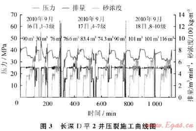 長深D平2井壓裂施工歷時(shí)3d,創(chuàng)造了中國石油壓裂史上的3項(xiàng)紀(jì)錄:①水平井深層氣井壓裂級數(shù)最多(10段);②單井總壓裂規(guī)模最大(838m3);③單級壓裂規(guī)模最大(116m3)(圖3)。