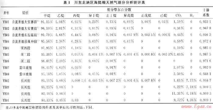 首先,長興組天然氣表現(xiàn)出特別干燥的特征,干燥系數(shù)大(一般大于0.999)。甲烷含量高,除甲烷、乙烷外,丙烷以上組分含量甚微或者不含。而陸相天然氣,尤其是自流井組天然氣相對(duì)較濕,部分天然氣干燥系數(shù)達(dá)0.93,表現(xiàn)出較濕的特征,含有少量的戊烷以上等重?zé)N組分(表1)。雷口坡組與須家河組天然氣特征接近,干燥系數(shù)均介于上述兩者之間,表現(xiàn)出相對(duì)較干燥特征,甲烷含量超過95%,乙烷以上等重?zé)N含量很低,基本不含戊烷等以上重?zé)N。