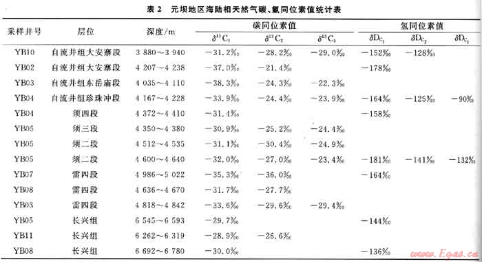 由圖2中可見,元壩地區(qū)海相長興組及飛仙關(guān)組的4個(gè)樣品點(diǎn)均落在右上角,甲烷氫同位素值(δD)大于-150%o;而雷口坡組及以上陸相地層樣品點(diǎn)則位于左下角,其δD普遍小于-150‰。由于二疊系為海相沉積環(huán)境,海水鹽度高,而陸相多為湖泊、沼澤相的淡水或微咸水沉積環(huán)境,水體鹽度低,加之下伏二疊系熠源巖比上覆陸相烴源巖具有更高的演化程度,因此,該區(qū)海陸相天然氣甲烷氫同位素值應(yīng)該同時(shí)受古沉積環(huán)境和演化程度的影響,結(jié)果導(dǎo)致天然氣的δD存在明顯差異。當(dāng)然,母質(zhì)類型也是影響氫同位素分餾效應(yīng)的因素之一。