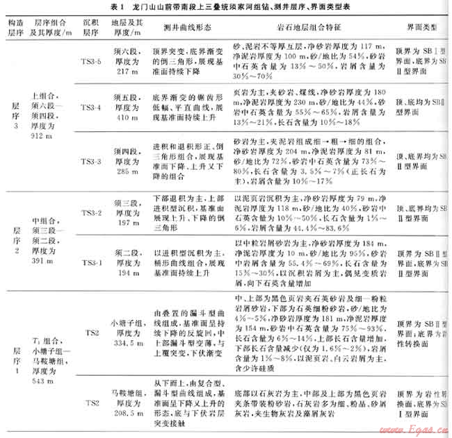 過去習(xí)慣上把上三疊統(tǒng)劃分為6段,其中一、三、五段為頁巖夾可采煤層的煤系地層,稱為富煤段;二、四、六段為砂巖,是富砂段也是含油氣的儲集層。據(jù)3條SBⅠ型層序界面劃分了3套構(gòu)造層序,據(jù)SBⅡ型層序界面和水泛面劃分了6套沉積層序(S01~S06),在層序內(nèi)識別了巖性轉(zhuǎn)換面,據(jù)此建立了上三疊統(tǒng)的層序地層剖面(圖1),須家河組各層序鉆、測井層序、界面類型見表1。