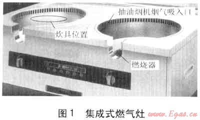 近幾年來(lái),市場(chǎng)上出現(xiàn)了一種集成式燃?xì)庠睿@種燃?xì)庠钭畲蟮奶攸c(diǎn)是,將抽油煙機(jī)煙氣吸入口與燃?xì)庠罱嚯x地集成在一起,見(jiàn)圖1。集成式燃?xì)庠畹某橛蜔煓C(jī)煙氣吸入口呈環(huán)型分布在燃燒器頭部的側(cè)上方,從炊具的側(cè)面吸走煙氣。
