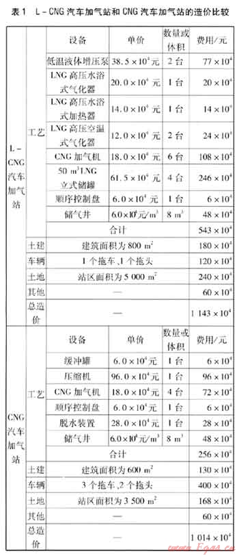 L-CNG汽車(chē)加氣站和CNG汽車(chē)加氣站的造價(jià)比較見(jiàn)表1。