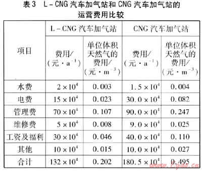 L-CNG汽車(chē)加氣站與CNG汽車(chē)加氣站的運(yùn)營(yíng)費(fèi)用比較見(jiàn)表3。