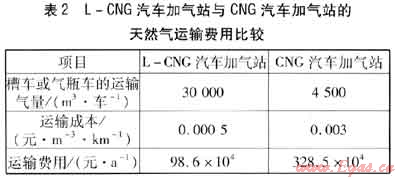 由于加氣站總運(yùn)營(yíng)費(fèi)用的90%以上是用于購(gòu)買(mǎi)和運(yùn)輸天然氣,因此從氣源點(diǎn)到加氣站的運(yùn)輸成本對(duì)加氣站的運(yùn)行費(fèi)用產(chǎn)生很大影響,進(jìn)而影響加氣價(jià)格。L-CNG汽車(chē)加氣站與CNG汽車(chē)加氣站的天然氣運(yùn)輸費(fèi)用比較見(jiàn)表2。