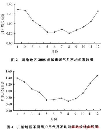 根據GB 50028—2006《城鎮(zhèn)燃氣設計規(guī)范》,月不均勻系數指計算月的日平均用氣量和年的日平均用氣量之比。應根據用戶前幾年逐月的用氣情況進行統(tǒng)計,計算用戶的月不均勻系數,同時在設計時充分預留,以便保障用氣高峰時期的供氣平穩(wěn)性和安全性。圖2為川渝地區(qū)2008年城市燃氣月不均勻系數圖,圖3為川渝地區(qū)不同用戶用氣月不均勻系數設計曲線圖。由圖2、3可知,川渝地區(qū)2008年的最大月不均勻系數為1.25,為了保障安全,設計取值為1.50[7]。
