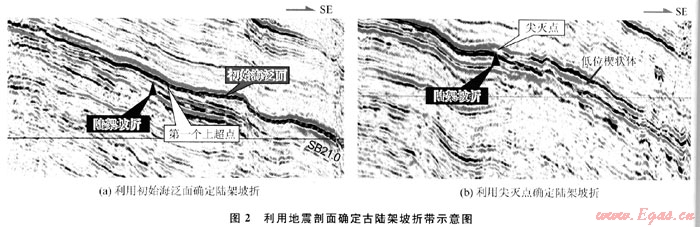 陸架坡折帶地形較為復(fù)雜,所以,確定陸架坡折點(diǎn)和范圍的方法非常重要。陸架坡折點(diǎn)為陸架最外緣坡度開(kāi)始明顯變化的點(diǎn),它位于陸架與陸坡之間過(guò)渡帶的向陸點(diǎn)。古陸架坡折點(diǎn)的識(shí)別則更加困難,主要依賴(lài)于地震資料,是在確定了層序邊界的基礎(chǔ)上進(jìn)行的??煞譃橐韵?種類(lèi)型加以識(shí)別。