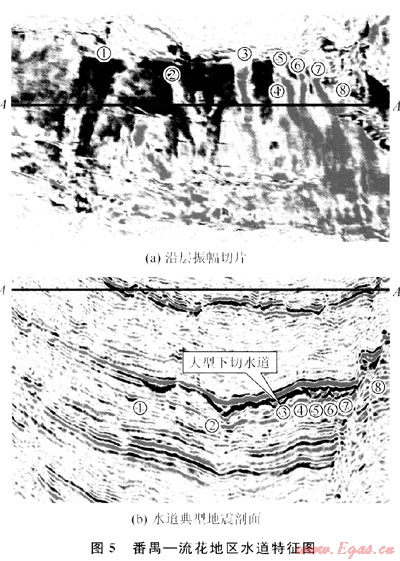 該區(qū)目前無(wú)鉆井鉆遇到該地質(zhì)體,但在該區(qū)東部,其水下水道的地震特征非常明顯:利用最新采集的3D地震資料,以精細(xì)的3D地震資料做基礎(chǔ),能夠清晰地觀察到水道的侵蝕、平面分布等特征。通過(guò)分析,發(fā)現(xiàn)了8條水道(圖5中①~⑧),自西向東依次排列,由北向南延伸,隨著坡度的逐漸減緩,在河道下方分別演化為扇狀朵體,并相互疊置(圖5-a)。這些水道在不同位置,其形態(tài)、寬度、長(zhǎng)度都不同,但具有相似的地震相特征:地震同相軸呈點(diǎn)、段式反射,下切特征明顯,振幅中等-高(圖5-b)。通過(guò)這些水道下切形態(tài)、深度、地震反射特征和沉積厚度,可推測(cè)其形成于同一時(shí)期,且物源均來(lái)自于正北方向。