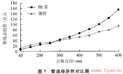 通過管徑與管線總投資關(guān)系的研究,當(dāng)采氣、集氣管道的公稱直徑小于等于200mm時(shí),采用PE管道,投資低;當(dāng)采氣、集氣管道的公稱直徑大于200mm時(shí),采用鋼制管道,投資低(圖7)。本示范工程中公稱直徑在200mm以下管線均采用PE100聚乙烯管線。