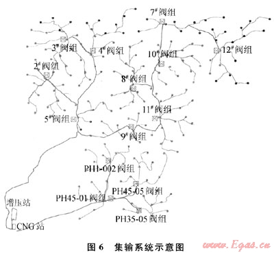 采用“分片集輸一級增壓”的集輸工藝,減少了中間場站增壓集輸環(huán)節(jié),優(yōu)化了集輸工藝,從而使采氣半徑大幅度增加,由相關(guān)規(guī)范上界定的“不宜大于5km”,增加到了17km,技術(shù)取得創(chuàng)新性重大突破,在相同規(guī)模氣田建設(shè)條件下,實(shí)現(xiàn)了由閥組代替集氣站,閥組與閥組之間的串聯(lián)枝狀布置,大大簡化了集輸設(shè)施,從而大幅度降低項(xiàng)目投資。這種集輸工藝在煤層氣田建設(shè)中首次應(yīng)用,取得了巨大成功,已申報(bào)國家發(fā)明專利(圖6)。