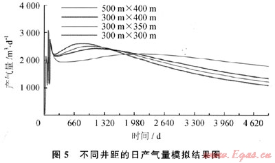 井間距是產(chǎn)量預(yù)測和經(jīng)濟(jì)評估的重要參數(shù),它決定著煤層氣開發(fā)的經(jīng)濟(jì)效益和煤層氣資源的回收率。井間距的大小取決于地質(zhì)條件、儲(chǔ)層性質(zhì)和生產(chǎn)規(guī)模對經(jīng)濟(jì)性的影響。為確定該區(qū)煤層氣開發(fā)合理的井網(wǎng)和井距,在儲(chǔ)層評價(jià)和歷史擬合的基礎(chǔ)上,利用先進(jìn)的儲(chǔ)層模擬軟件分別模擬了不同井間距的煤層氣產(chǎn)能(圖5)。針對不同井間距的布置,綜合應(yīng)考慮本區(qū)構(gòu)造裂隙和煤層主裂縫發(fā)育方向、煤層氣井產(chǎn)氣高峰期到達(dá)時(shí)間、氣井產(chǎn)能和煤層氣最終采收率等主要因素,對比分析并考慮經(jīng)濟(jì)評價(jià)的結(jié)果,在該地區(qū)采用300m×300m正方形井距布井最為經(jīng)濟(jì)合理,井網(wǎng)方位確定為N60°E方向和N30°W,在實(shí)際應(yīng)用中取得良好的效果,并在柿莊南、樊莊等地進(jìn)行推廣應(yīng)用。