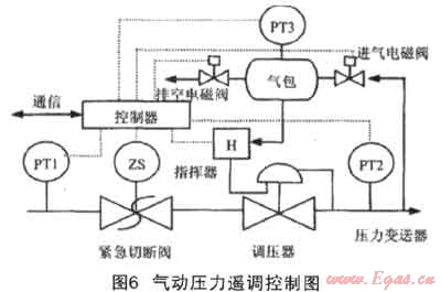 CS壓力遙調通過導壓管引入外部壓力,通過控制一個氣包的進、出口電磁閥來調節(jié)氣包內的壓力,進而可以控制指揮器噴嘴噴出的燃氣壓力,最終控制調壓器的出口壓力,如圖6[2]。