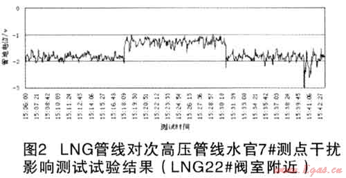 由于部分路段次高壓天然氣管道與上游LNG管道和成品油管道并行(采用外加電流陰極保護(hù)),為了判斷LNG管線對(duì)次高壓管線的影響,技術(shù)人員進(jìn)行了現(xiàn)場(chǎng)測(cè)試,主要包括:LNG管線的保護(hù)電位、次高壓管線保護(hù)電位,并在LNG管線平湖門站陰極保護(hù)站恒電位儀開(kāi)10分鐘一停10分鐘一開(kāi)10分鐘共30分鐘的時(shí)間段內(nèi),用記錄儀檢測(cè)了次高壓管線的陰極保護(hù)電位波動(dòng)情況。通過(guò)檢測(cè)發(fā)現(xiàn),LNG管線和次高壓管線閉路電位都不穩(wěn),波動(dòng)較大。