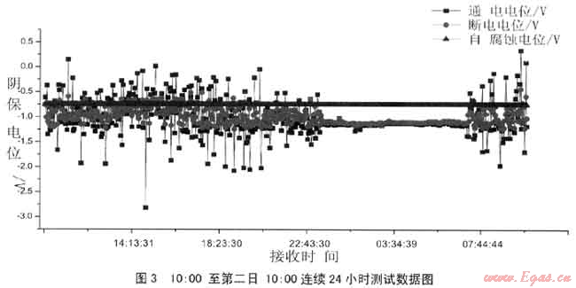(3) 通過圖表不同時間段的數(shù)據(jù)分析可以看到,遠(yuǎn)程監(jiān)測系統(tǒng)可以實(shí)時、連續(xù)的監(jiān)測一天24小時之內(nèi)的自然電位、通電電位和斷電電位的變化情況,對管道安全穩(wěn)定運(yùn)行提供了科學(xué)的管理依據(jù)。