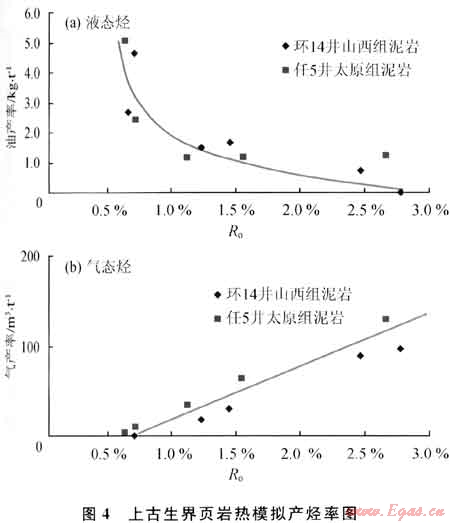 鄂爾多斯盆地環(huán)14井山西組頁(yè)巖和任5井太原組頁(yè)巖的熱模擬實(shí)驗(yàn)結(jié)果表明(圖4):Ro<0.7%時(shí),幾乎沒有氣態(tài)烴產(chǎn)出;Ro介于0.7%~1.1%時(shí),液態(tài)烴產(chǎn)率隨Ro增大迅速下降,而氣態(tài)烴產(chǎn)率則迅速增大,但產(chǎn)率數(shù)值還很小;Ro>1.1%時(shí),液態(tài)烴產(chǎn)率隨Ro增大緩慢下降,而氣態(tài)烴產(chǎn)率隨R,增大迅速增大;Ro為2.5%時(shí)的氣態(tài)烴產(chǎn)率達(dá)到110m3/t(有機(jī)碳)。從該區(qū)上古生界頁(yè)巖的Ro大都超過1.1%可見,上古生界頁(yè)巖以生成氣態(tài)烴為主,僅有少量液態(tài)烴。