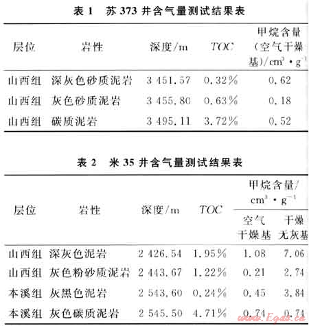 含氣量是評(píng)價(jià)頁(yè)巖含氣性的最重要指標(biāo)。由于頁(yè)巖氣勘探在鄂爾多斯盆地尚處于探索階段,在石炭-二疊系泥頁(yè)巖段很難設(shè)計(jì)取心,因此2010年筆者在蘇373和米35井砂巖段的取心過程中,挑選了其中夾持的泥頁(yè)巖段進(jìn)行含氣量分析,雖然不能完全代表石炭-二疊系泥頁(yè)巖段的真實(shí)含氣量,但也具有一定的參考價(jià)值。