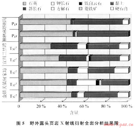 鄂爾多斯盆地下二疊統(tǒng)太原組、山西組和上三疊統(tǒng)長(zhǎng)7段頁(yè)巖出露廣泛,厚度較大。其中太原組、山西組石英含量較高,為46.51%~54.04%;黏土含量偏高,為43.61%~47.81%。山西省呂梁市柳林縣成家莊鎮(zhèn)太原組黑色頁(yè)巖野外露頭樣品X射線衍射全巖分析結(jié)果顯示:石英含量為54.04%,斜長(zhǎng)石含量為2.35%,黏土含量為43.61%。麻塔則溝下二疊統(tǒng)山西組中部黑色頁(yè)巖,石英含量為48.74%,斜長(zhǎng)石含量為2.28%,鉀長(zhǎng)石含量為1.17%,黏土含量為47.81%;底部石英含量為46.51%,斜長(zhǎng)石含量為2.33%,菱鐵礦含量為0.81%,黏土含量為44.87%,硬石膏含量為5.48%(圖5)。