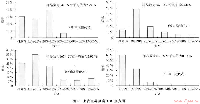 本溪組、太原組和山西組TOC較高(圖1),一般介于1.00%~5.O0%,其中本溪組TOC最高,峰值在2.00%~5.O0%。本溪組、太原組和山兩組二段3套頁(yè)巖TOC平均值分別為2.79%、2.68%和2.93%。