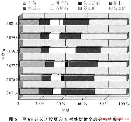 長(zhǎng)7段野外露頭樣品脆性礦物石英與斜長(zhǎng)石含量高,黏土含量低。位于陜西省銅川市金鎖關(guān)鎮(zhèn)何家坊的長(zhǎng)7段黑色頁(yè)巖X射線衍射全巖分析結(jié)果顯示:石英含量為42.92%~47.18%,斜長(zhǎng)石含量為5.52%~9.06%,鉀長(zhǎng)石含量為6.07%~18.06%,黏土含量為24.41%~31.01%,方解石、鐵白云石、菱鐵礦含量沒有或很少。宜川三里灣露頭樣品石英含量比銅川金鎖關(guān)鎮(zhèn)何家坊野外露頭樣品低,但斜長(zhǎng)石含量要高得多,脆性礦物石英加斜長(zhǎng)石含量相當(dāng),黏土含量也較低。里68井的巖心分析資料表明:石英含量為17.00%~23.O0%,斜長(zhǎng)石含量為5.O0%~10.00%,鉀長(zhǎng)石含量為6.00%~15.00%,黏土含量為20.00%~30.O0%,方解石、鐵白云石、菱鐵礦含量沒有或較少(圖6)。巖心樣品除石英含量偏低外,其余礦物含量與露頭樣品接近。