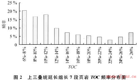 長(zhǎng)7段頁(yè)巖TOC很高(圖2),主要分布于6.O0%~14.00%之間,最高可超過26.O0%。殘留氯仿瀝青 “A”含量大都介于0.70%~1.00%。熱解生烴潛量主要介于10~60mg/g,最高逾100mg/g。