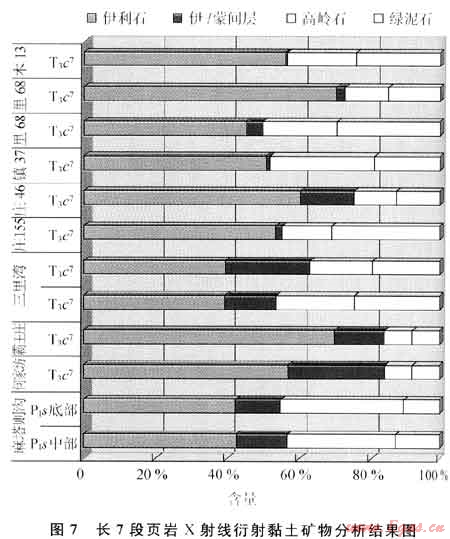 長(zhǎng)7段頁(yè)巖分布穩(wěn)定,可對(duì)比性強(qiáng)。巖心樣品X射線衍射黏土礦物分析結(jié)果顯示:伊利石含量為38.05%~66.10%,伊/蒙間層含量為1.O0%~25.00%,高嶺石含量為5.15%~27.03%,綠泥石含量為7.18%~32.37%(圖7)。巖心及野外露頭觀察表明,長(zhǎng)7段頁(yè)巖外觀呈黑色,質(zhì)純,偶見介形蟲、魚類化石及星點(diǎn)狀黃鐵礦,并可見到泥包砂等深水沉積構(gòu)造,深湖-半深湖相沉積特征明顯。同時(shí),頁(yè)巖段中普遍夾有薄層凝灰?guī)r和砂質(zhì)頁(yè)巖,反映了湖盆的輕微震蕩和古氣候環(huán)境的變化。