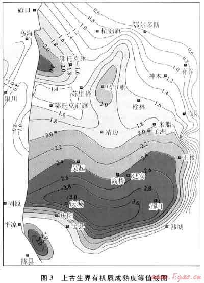 鄂爾多斯盆地上古生界地層的Ro集中在1.1%~2.5%,大部分處于高成熟階段,其Ro等值線圖顯示出(圖3),慶城-宜川一帶熱演化程度最高,Ro達(dá)到3.0%;烏審旗一帶Ro約為2.0%,鄂托克旗地區(qū)局部Ro最高達(dá)3.0%。除東北部杭錦旗 鄂爾多斯-府谷一線以外、東南部大荔向外、西南部固原以西等盆地邊緣地區(qū),上古生界地層絕大部分地區(qū)Ro均超過1.1%,達(dá)到了形成頁(yè)巖氣藏的成熟度標(biāo)準(zhǔn)。其中榆林地區(qū)Ro介于1.1%~2.5%,處于有利于生成頁(yè)巖氣的成熟度范圍內(nèi)。
