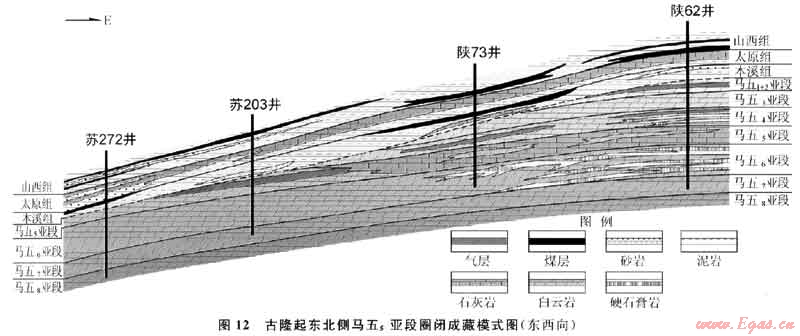 構造翻轉后對靖西地區(qū)奧陶系中、下組合的天然氣成藏產(chǎn)生了2個方面的重要影響:①馬五5區(qū)域巖性相變的致密石灰?guī)r一側正處于構造的上傾方向,從而對其西側的白云巖儲集體構成了有效的巖性遮擋條件(圖12);②由于東側上傾,使得上古生界煤系烴源巖層與下古生界白云巖儲層在風化殼界面附近由原來的上下接觸關系變成一定程度的側向(或左右)甚至“源下儲上”的接觸關系,從而更有利于烴類氣體在白云巖儲集體中的充注成藏。
