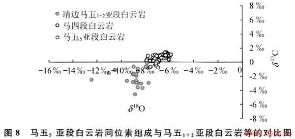 5) 大氣淡水與“富鎂鹵水”混合的白云巖化模式:由于大氣淡水的參與,在古隆起東側地區(qū)的馬五5沉積層中形成大氣淡水與“富鎂鹵水”的混合水帶,這種成巖介質環(huán)境對馬五5的白云巖化作用也會產(chǎn)生顯著的影響,主要表現(xiàn)在2個方面:①稀釋了“富鎂鹵水”,使成巖流體濃度降低,進而減少白云石結晶時的結晶中心形成總數(shù)(晶核形成數(shù)),這會使白云石生長更趨緩慢,結晶更趨自形、粗大;②使先成白云石重結晶。據(jù)Clyde Moore的研究認為[13],大氣淡水的參與會使先成白云石重結晶,并使其地球化學特征發(fā)生重組,這也會導致其晶體結構變粗和白云石自形程度的提高。對盆地古隆起東側馬五5白云巖的地球化學分析結果表明:馬五5白云巖有序度一般為0.85~0.95,尤其是其C—0同位素特征(δ13C:-0.79‰~0.07‰;δ18O:-7.1‰~-6.9‰),的確與馬五1+2蒸發(fā)潮坪形成的泥粉晶白云巖存在較大的差異(圖8)。