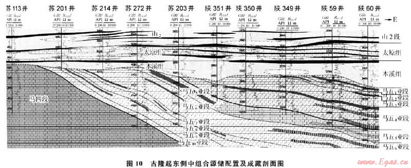 晚石炭世盆地整體沉降后,鄂爾多斯地區(qū)又開始接受石炭-二疊紀海陸交互相及陸相沉積,使上古生界的煤系地層在該區(qū)與奧陶系中組合及下組合地層直接接觸。到印支末燕山期,隨著上古生界煤系烴源巖熱演化成熟進入烴類氣體的大量生成階段后,即可對下古生界的奧陶系中組合及下組合儲層供氣,構成良好的源儲配置關系(圖10)。