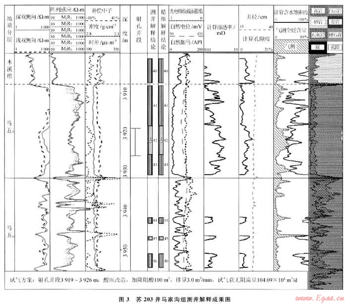 在上述認識的指導下,2009—2010年在蘇里格地區(qū)上古生界砂巖氣藏的勘探中,繼續(xù)堅持兼探下古生界,圍繞古隆起東側的中組合領域終于在蘇203井和蘇322井的鉆探中取得了重大的突破:蘇203井在馬五5鉆遇較好的白云巖晶間孔儲層,含氣顯示良好,測井解釋氣層厚度為7.4m,試氣獲得104.0882×104m3/d的高產(chǎn)氣流(圖3);蘇322井馬五6鉆遇白云巖儲層,測井解釋氣層厚度為3.8m,試氣獲得41.5904×104m3/d的高產(chǎn)氣流。隨后的研究證實,馬五5含氣層段為白云巖晶間孔型儲層,明顯不同于靖邊地區(qū)馬五1+2的風化殼溶孔型儲層,圈閉成藏特征也與靖邊地區(qū)的風化殼氣藏存在較大差異,從而展開了對古隆起東側地區(qū)中組合沉積及成藏規(guī)律的綜合研究,形成了古隆起東側地區(qū)中組合存在區(qū)域性巖性圈閉成藏有利區(qū)帶的新認識,奠定了中組合規(guī)??碧桨l(fā)現(xiàn)的基礎。近期鉆探的蘇345井在馬五5試氣又獲得225.44×104m3/d的高產(chǎn)工業(yè)氣流,目前已落實烏審召、烏審旗、安邊、吳起4個中組合成藏含氣富集區(qū),初步估算天然氣儲量規(guī)模超過1000×108m3。