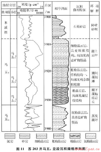 其次,從大的巖性帶內部來看,也存在次一級的巖性變化(即沉積微相類型的變化)。按照Walther相律的原理[16],在連續(xù)發(fā)育的地層序列中,縱向上連續(xù)的沉積必然在橫向上相鄰,因此通過對蘇203井等馬五5沉積微相序列的分析(圖11),就可以初步確定馬五5地層在鄰近區(qū)域橫向相鄰的微相變化規(guī)律,蘇203井區(qū)馬五5主力儲層段發(fā)育在中部(馬五52)的藻屑灘相白云巖中,其下部(馬五53)的藻粘結巖丘白云巖和上部(馬五51)的潮上蒸發(fā)云坪白云巖,則分別代表了其東側和西側相鄰的微相環(huán)境,即在大的白云巖分布區(qū)帶內,可進一步細分出顆粒灘及灘間低能環(huán)境的沉積類型。它們雖同為白云巖,但由于沉積微相環(huán)境及成巖作用特征不同,因而具有不同的物性特征,并進而構成次一級的巖性相變特征。