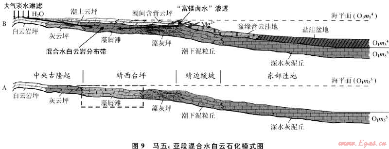 4) 大氣淡水的參與:在馬五5沉積后進入馬五4沉積期時,古隆起地區(qū)大部分時間處于間歇暴露的沉積環(huán)境,當發(fā)生大氣降水時,大面積的降水會在陸地上匯聚后向古隆起兩側地區(qū)下滲分散,當其進入古隆起東側先期沉積的馬五5沉積層中時,也會對馬五5沉積起到一定的改造作用。淡水作用的直接效果是會導致碳酸鹽沉積物(尤其是文石及方解石等CaC03礦物)的部分溶解,其所產(chǎn)生的Ca2+離子也會對鄰近沉積區(qū)石膏的沉淀起到一定的促進作用,從而進一步推動上述“石膏沉淀-白云石化交代”的地球化學循環(huán)過程。