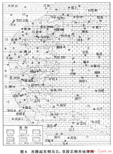 靖邊氣田是發(fā)育在盆地中部奧陶系馬家溝組碳酸鹽巖古風化殼頂部的古地貌圈閉(地層圈閉的一種特殊形式),其主力儲層是馬五1+2風化殼溶孔型儲層,儲層孔隙發(fā)育受含膏云坪沉積相帶及巖溶古地貌的控制極為明顯,圈閉類型主要為巖溶古地貌圈閉[3~7]。該氣田被發(fā)現(xiàn)后,經(jīng)歷了20世紀90年代的快速探明和高效開發(fā)階段,很快躋身我國陸上最大的整裝碳酸鹽巖氣田。進入21世紀以來、圍繞靖邊氣田周邊地區(qū)的天然氣勘探及地質研究工作不斷持續(xù)和深入,在該氣田的東側及西部都相繼取得了較大的研究和勘探進展,探明儲量較20世紀幾近翻番。截至目前,已在盆地中部下古生界探明天然氣地質儲量逾4000×108m3,開發(fā)建成50×108m3的年生產(chǎn)能力,成為向北京、天津及其周邊大中城市供氣的主力氣源。隨著21世紀以來盆地上古生界致密砂巖氣藏勘探的逐步深入,盆地下古生界碳酸鹽巖天然氣勘探能否取得新的更大的突破,成為近期勘探家們亟待回答的問題。
