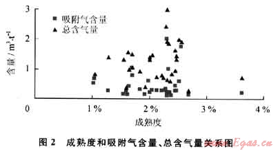 中國(guó)海相頁(yè)巖具有成熟高的特點(diǎn)(圖1),以中國(guó)南方地區(qū)下寒武統(tǒng)黑色頁(yè)巖為例,大部分地區(qū)的成熟度大于3%,處于過(guò)成熟晚期階段,局部地區(qū)的成熟度均超過(guò)4%,達(dá)到變質(zhì)期,失去生氣能力[9~11]。雖然局部地區(qū)的成熟度偏高,但是高的有機(jī)碳含量預(yù)示著這些層位可能是頁(yè)巖氣發(fā)育的有利層位,如在黔中隆起的方深1井的下寒武統(tǒng)牛蹄塘組,成熟度(Ro)高達(dá)5.5%,有機(jī)碳含量高達(dá)8.02%,對(duì)牛蹄塘組黑色頁(yè)巖的壓裂測(cè)試表明,仍有天然氣產(chǎn)出。因此,不難看出即使是高成熟度的頁(yè)巖,也可能有天然氣賦存??傮w來(lái)講,高成熟度對(duì)頁(yè)巖氣藏來(lái)說(shuō)是不利的,在高成熟度條件下,主要看頁(yè)巖保存條件的好壞,如果保存條件好,即使成熟度高也能形成頁(yè)巖氣藏。筆者對(duì)四川盆地及其周緣下寒武統(tǒng)和上奧陶統(tǒng)-下志留統(tǒng)41塊黑色頁(yè)巖的成熟度和含氣量的關(guān)系可以看出,成熟度(Ro)介于1.1%~3.0%時(shí),吸附氣含量達(dá)到最大值區(qū)域,平均超過(guò)1m3/t,最大超過(guò)2m3/t,總含氣量也達(dá)到最大值區(qū)域,平均超過(guò)2m3/t。在小于1.1%和大于3.0%時(shí),吸附氣含量和總含氣量均有不同程度的降低,前者因?yàn)樘幵谏痛?濕氣),生氣量有限且溶解于石油中,后者成熟度過(guò)高,生氣能力有限,均導(dǎo)致吸附氣含量不高(圖2)。無(wú)論成熟度高低,在頁(yè)巖層中,均有天然氣賦存,甚至形成頁(yè)巖氣藏。