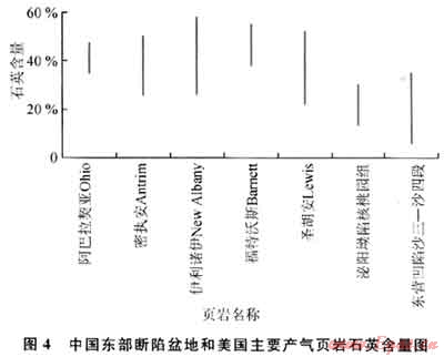 與美國(guó)主要產(chǎn)頁(yè)巖氣盆地類比,中國(guó)陸相頁(yè)巖具有分布局限、埋藏普遍較深、脆性礦物含量低、黏土含量高(圖4),具有成藏機(jī)理和成藏條件特殊以及不利于后期改造等不利因素,需要在今后的工作中,加強(qiáng)陸相頁(yè)巖油氣地質(zhì)理論和開(kāi)采技術(shù)的研究。
