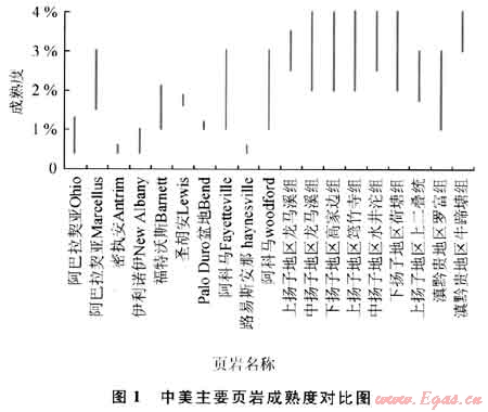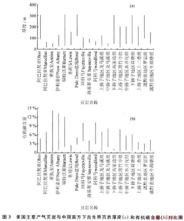 筆者對(duì)四川盆地及其周緣重慶市秀山縣溶溪鎮(zhèn)等16塊樣品分析,有機(jī)碳含量分布在0.28%~6.37%,平均為2.44%,普遍大于1%(其中大于1%的樣品數(shù)占樣品總數(shù)的80%,大于2%的樣品數(shù)占樣品總數(shù)的53.3%),這些均表明下寒武統(tǒng)黑色頁(yè)巖的有機(jī)碳含量高。中揚(yáng)子、下?lián)P子等地的古生界烴源巖也均具有厚度大、有機(jī)碳含量高等優(yōu)點(diǎn),可與美國(guó)主要產(chǎn)氣頁(yè)巖盆地進(jìn)行對(duì)比(圖3)。