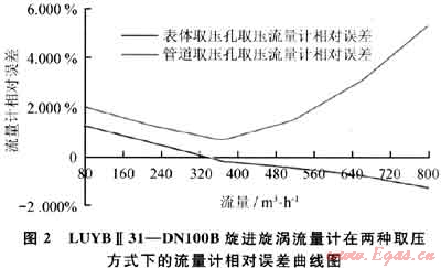 由表1、2得到LUYBⅡ31—DN1008旋進旋渦流量計在兩種取壓方式下的流量計相對誤差曲線如圖2所示。