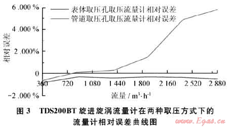 以某公司生產(chǎn)的TDS200BT旋進旋渦流量計為例,系統(tǒng)運行時間為60s,標(biāo)準(zhǔn)裝置的滯止平均溫度為29.7℃,空間平均濕度為42%,流量計的平均溫度為29.3℃,在表體取壓孔取壓和管道取壓孔取壓的流量計檢定試驗數(shù)據(jù)分別如表3、4所示。兩種取壓方式下的流量計相對誤差曲線如圖3所示。