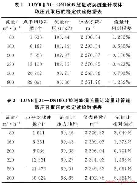 以使用廣泛的LUYBⅡ31—DN1008旋進旋渦流量計為例,系統(tǒng)運行時間為60s,標(biāo)準(zhǔn)裝置的滯止平均溫度為28.9℃,空間平均濕度為30%,流量計的平均溫度為28.3℃,在表體取壓孔取壓和管道取壓孔取壓的流量計檢定試驗數(shù)據(jù)分別如表1、2所示。