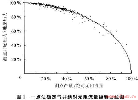 氣井生產(chǎn)能力通常以氣井絕對無阻流量大小衡量。氣井絕對無阻流量定義為:氣井開井生產(chǎn)時井底流壓等于1大氣壓(101.325kPa)條件下的日產(chǎn)氣量(qaof)。用氣井只測試一點所獲得的數(shù)據(jù)來求qaof的經(jīng)驗方法簡稱為一點法。