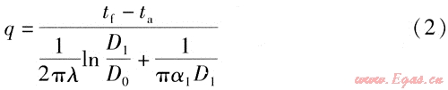 忽略管道的導(dǎo)熱熱阻、燃氣與管道內(nèi)表面對流換熱的熱阻,得到公式(2)[4]。
