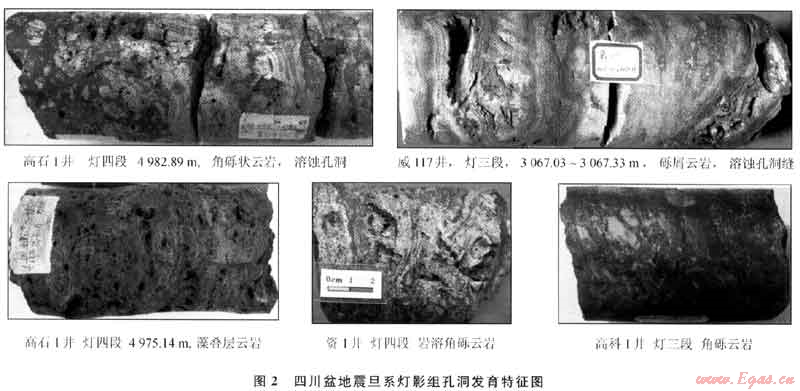 震旦系燈影組下部(燈二段)也有儲(chǔ)層發(fā)育。由于其埋藏較深、含水層較多,以前并未給予足夠重視,對(duì)其取得的實(shí)物資料較少,研究程度不高。從目前不多的資料來(lái)看,它和上部的儲(chǔ)層發(fā)育特征有所差異,主要表現(xiàn)為溶洞規(guī)模降低,孔隙層增多。巖心描述顯示:燈影組向下大型縫洞減少,小型孔洞占據(jù)優(yōu)勢(shì),高科1井燈影組巖心統(tǒng)計(jì),溶洞巖心累計(jì)28.57m,其中燈四段11.45m(占40.1%),燈三段12.20m(占42.7%),燈二段4.92m(占17.2%),顯示出向下溶洞發(fā)育減弱。但是在基質(zhì)物性方面,下部?jī)?chǔ)層有變優(yōu)的趨勢(shì),表明孔隙層增多,借此可以彌補(bǔ)溶洞層減少的不足。