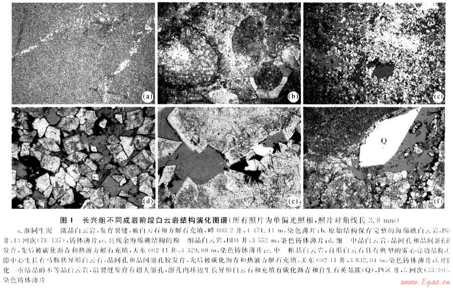 處于埋深1000~4000m的中深埋藏成巖環(huán)境,伴隨沿?cái)嗔褞У构噙M(jìn)入長興組的熱鹵水成巖流體增量、增溫和增壓,導(dǎo)致更強(qiáng)烈的熱液白云巖化和重結(jié)晶作用,以及相伴隨的溶蝕作用和天青石化、硬石膏化等各類次生熱液礦物的沉淀和充填膠結(jié)作用。