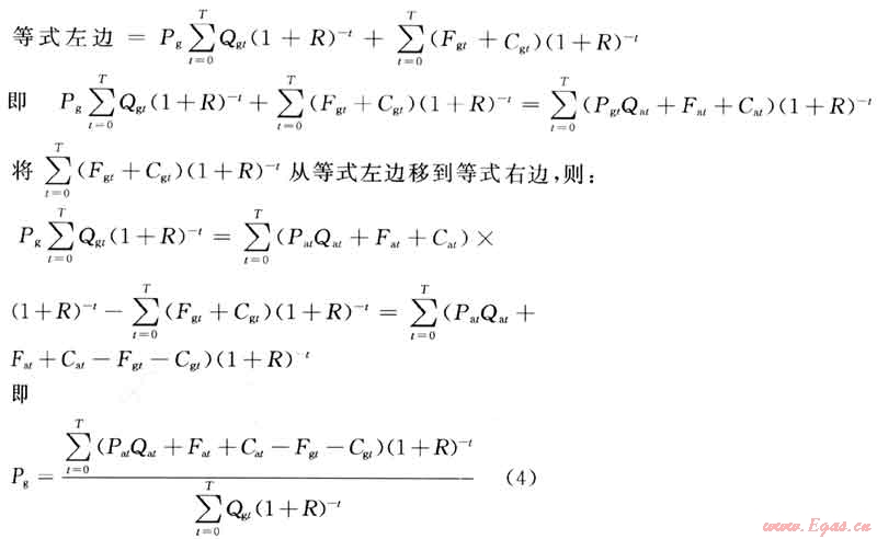 設T為使用裝置的經濟壽命期年限;t為使用裝置經濟壽命期內的某1年,從開始年(0年)到第T年;Pg為替代前提下天然氣長期使用經濟價值(它是用計算期開始年初現值度量的計算期內的平均值,常數);Qgt為達到相同使用效果情況下t年需要消耗的天然氣量;Fgt為達到相同使用效果情況下建設使用天然氣的裝置t年需要投入的固定資產投資;Cgt為達到相同使用效果情況下使用天然氣裝置t年需要發(fā)生的除折舊和天然氣費用以外的其他完全成本(其中還包括營業(yè)費用、財務費和管理費);R為企業(yè)內部收益率;Pat為t年等價替代物價格;Qat為達到相同使用效果情況下t年需要消耗的替代物數量;Fat為達到相同使用效果情況下建設使用替代物的裝置t年需要投入的固定資產投資;Cat為達到相同使用效果情況下使用替代物的裝置t年需要發(fā)生的除折舊和替代物費用以外的其他完全成本(其中還包括營業(yè)費用、財務費和管理費)。