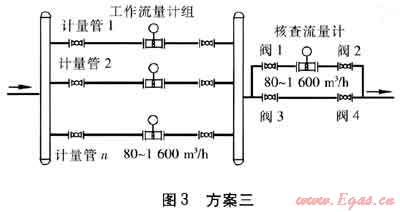 上述方案二中的流量計(jì)1和流量計(jì)2可以串聯(lián)達(dá)到互相核查的目的,但在更多流量計(jì)并聯(lián)組成的計(jì)量系統(tǒng)中就需要考慮設(shè)立單獨(dú)的核查流量計(jì)。如圖3,方案三中有工作流量計(jì)n臺(tái),每臺(tái)流量計(jì)的測(cè)量范圍是80~1600m3/h,系統(tǒng)的測(cè)量范圍是(80~1600)n m3/h。核查流量計(jì)是一臺(tái)80~1600m3/h的流量計(jì)。正常工作時(shí),工作流量計(jì)根據(jù)供氣量,可以運(yùn)行在不同的開(kāi)備組合下,核查流量計(jì)前后閥門1和閥門2關(guān)閉,閥門3和閥門4開(kāi)啟,核查流量計(jì)不投入運(yùn)行。需要對(duì)工作流量計(jì)進(jìn)行核查比對(duì)時(shí),閥門1和閥門2開(kāi)啟,閥門3和閥門4關(guān)閉,核查流量計(jì)投入運(yùn)行。通過(guò)閥門開(kāi)閉,任何一臺(tái)工作流量計(jì)都可以和核查流量計(jì)形成串聯(lián)運(yùn)行,進(jìn)行核查比對(duì)。