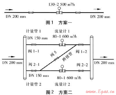 圖1、2為某城市天然氣門站計(jì)量系統(tǒng)工藝管路方案一和方案二。兩個(gè)方案相比較,方案一結(jié)構(gòu)簡(jiǎn)單,工程造價(jià)較低,方案二則相反。但是,采用兩管并聯(lián)的方案二,可以使整個(gè)計(jì)量系統(tǒng)的測(cè)量范圍從130~2500m3/h(量程比20:1)擴(kuò)展到80~3200m3/h(量程比40:1)。在門站運(yùn)行過(guò)程中,如果遇到流量波動(dòng)較大時(shí),方案二可以隨時(shí)打開(kāi)或關(guān)閉兩臺(tái)流量計(jì)中的一臺(tái),使流量計(jì)量?jī)x表始終工作在0.2qmax到0.8qmax這一計(jì)量性能最優(yōu)的范圍段(qmax為最大流量),從而保證整個(gè)計(jì)量系統(tǒng)的計(jì)量性能最優(yōu)。另外在流量計(jì)1或流量計(jì)2中的某一臺(tái)出現(xiàn)故障或進(jìn)行周期檢定時(shí),可以使用單臺(tái)流量計(jì)供氣運(yùn)行的方式,避免城市門站供氣中斷的情況發(fā)生。