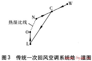 一次回風(fēng)空調(diào)系統(tǒng)焓一濕圖見(jiàn)3。狀態(tài)W的室外新風(fēng)與狀態(tài)N的室內(nèi)回風(fēng)混合處理到狀態(tài)C,經(jīng)過(guò)表冷器冷卻除濕到狀態(tài)L(機(jī)器露點(diǎn)),然后經(jīng)過(guò)電加熱器加熱到送風(fēng)狀態(tài)0送入房間,吸收房間余熱余濕,沿?zé)釢癖染€(xiàn)到狀態(tài)N。一次回風(fēng)空調(diào)系統(tǒng)的主要缺點(diǎn)是:被處理空氣先冷卻后再熱,存在冷熱抵消問(wèn)題;表冷器在濕工況下工作,需要溫度較低的冷源。