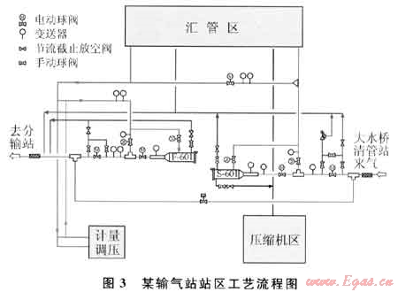 某輸氣站海拔3000m,占地面積逾3×104m2。此前該站僅為清管站,2007年增壓站投產(chǎn)運(yùn)行。站區(qū)分為綜合值班區(qū)、工藝裝置區(qū)、壓縮機(jī)組區(qū)和場(chǎng)外放空區(qū)。全站實(shí)現(xiàn)了場(chǎng)站自動(dòng)化控制,采用SCADA系統(tǒng)對(duì)工藝參數(shù)進(jìn)行采集和監(jiān)控。該站具備天然氣增壓、除塵過濾、數(shù)據(jù)采集和上傳、收發(fā)清管器、天然氣放空與泄壓、發(fā)電、供暖等功能,是一個(gè)標(biāo)準(zhǔn)化的壓縮機(jī)站場(chǎng)。站內(nèi)管線設(shè)計(jì)壓力6.3MPa。圖3為某輸氣站站區(qū)工藝流程圖。