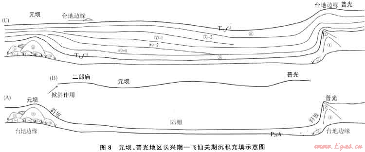 運(yùn)用二維、三維地震資料與鉆井資料相結(jié)合對(duì)元壩、普光地區(qū)長(zhǎng)興組-飛仙關(guān)組沉積時(shí)期沉積充填模式進(jìn)行了分析(圖8),結(jié)果認(rèn)為:兩地區(qū)長(zhǎng)興期沉積主要受早期古地貌控制,元壩地區(qū)長(zhǎng)興組沉積早期由臺(tái)地沉積逐漸演化為深水沉積,坡度緩(僅3°~5°),斜坡寬,這也就造就了早期生屑灘沉積在一個(gè)環(huán)境相似的范圍內(nèi)疊置遷移,灘體發(fā)育面積大,在生物生長(zhǎng)過程中逐漸形成最為適合生物生長(zhǎng)的位置發(fā)育成為生物礁快速沉積,礁后灘發(fā)育;同時(shí)側(cè)向快速遷移,生物礁分布面積大;而普光地區(qū)長(zhǎng)興組沉積早期,臺(tái)地-斜坡有明顯的坡折,坡度大(15°左右),適合生物生長(zhǎng)的范圍被局限在一定的范圍,礁灘沉積具有垂向加積特征,礁后灘不發(fā)育(圖8)。在地震剖面上元壩地區(qū)發(fā)育前積體,而普光地區(qū)前積體則不發(fā)育。