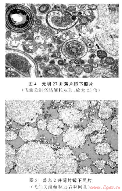 在普光地區(qū)發(fā)育厚層鮞粒灘壩,構(gòu)成普光氣田的主要儲(chǔ)層;而元壩地區(qū)則發(fā)育大片的鮞粒灘,但單層厚度較小,橫向變化快。普光地區(qū)飛一段-飛二段主要由鮞粒云巖、石灰?guī)r組成,飛三段由石灰?guī)r夾膏巖和白云巖組成,儲(chǔ)層主要分布于飛一段-飛二段的鮞粒云巖和粉-細(xì)晶云巖中,儲(chǔ)集厚度大、分布廣、物性好;元壩地區(qū)飛仙關(guān)組以兩個(gè)大的向上變淺的旋回為特征,飛一段-飛三段儲(chǔ)層主要分布在飛二段-飛三段的鮞粒灰?guī)r中,儲(chǔ)集性能總體較差。