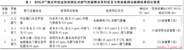 當(dāng)車(chē)載式0MDTM光學(xué)甲烷探測(cè)儀甲烷值超標(biāo)報(bào)警后(設(shè)定為20ppm),可用RMLDTM激光甲烷遙距檢測(cè)儀檢測(cè)在報(bào)警30m范圍內(nèi)的燃?xì)庠O(shè)施和相鄰管溝的CH4值,確定泄漏源,調(diào)頻后再檢測(cè)C0值(無(wú)管溝不需檢測(cè)),若C0值大于CH4值的0.18倍,則可判定為煤氣泄漏所致。表1是對(duì)該城市1條在役管線(xiàn)及支線(xiàn)用RMLDTM檢測(cè)儀進(jìn)行的燃?xì)庑孤┣闆r再判定及與傳統(tǒng)檢測(cè)法檢測(cè)結(jié)果的比較表。
